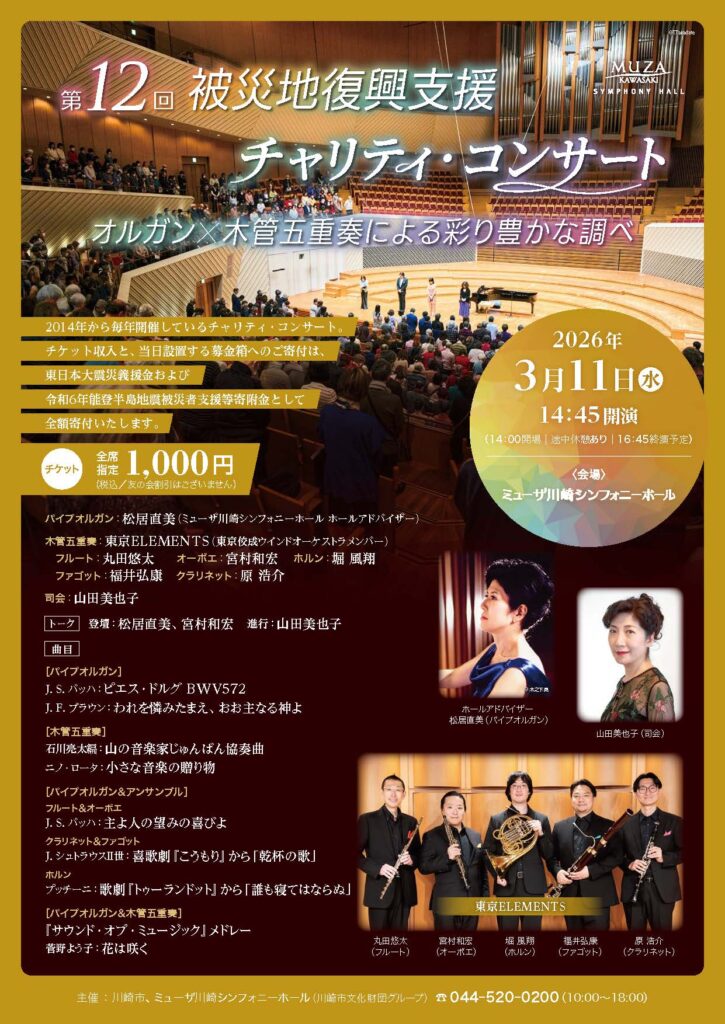 第12回 被災地復興支援チャリティ・コンサート オルガン×木管五重奏による彩り豊かな調べ [2026年3月11日(水)]