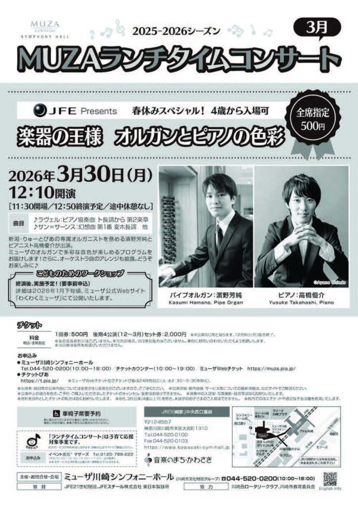 JFE Presents MUZAランチタイムコンサート 3月 《春休みスペシャル!4歳から入場可》 楽器の王様 オルガンとピアノの色彩 [2026年3月30日(月)]